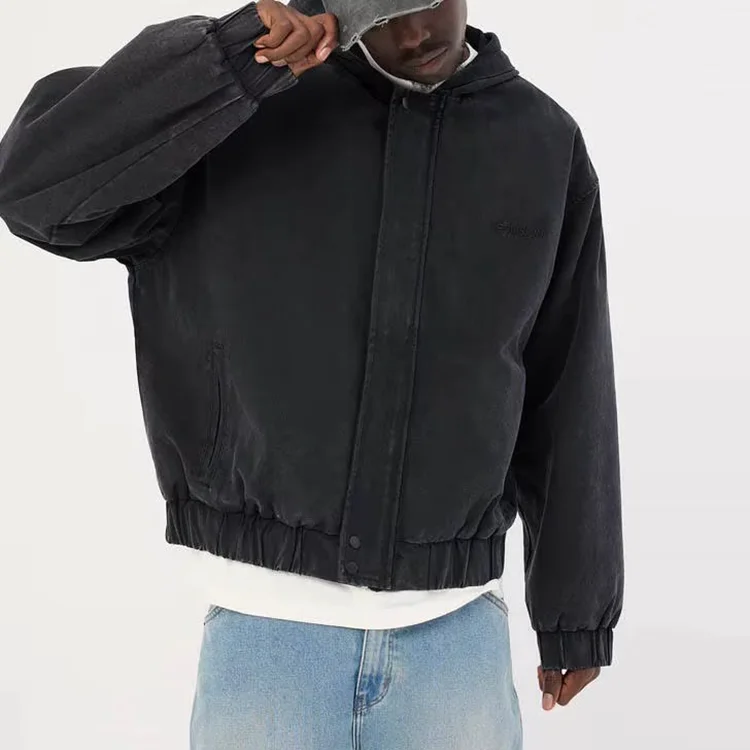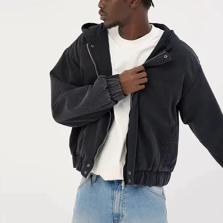 Custom Men Woven Cotton Jacket Turn Down Collar Canvas Black Vintage Washed Jacket Outdoor Casual Coat for Men